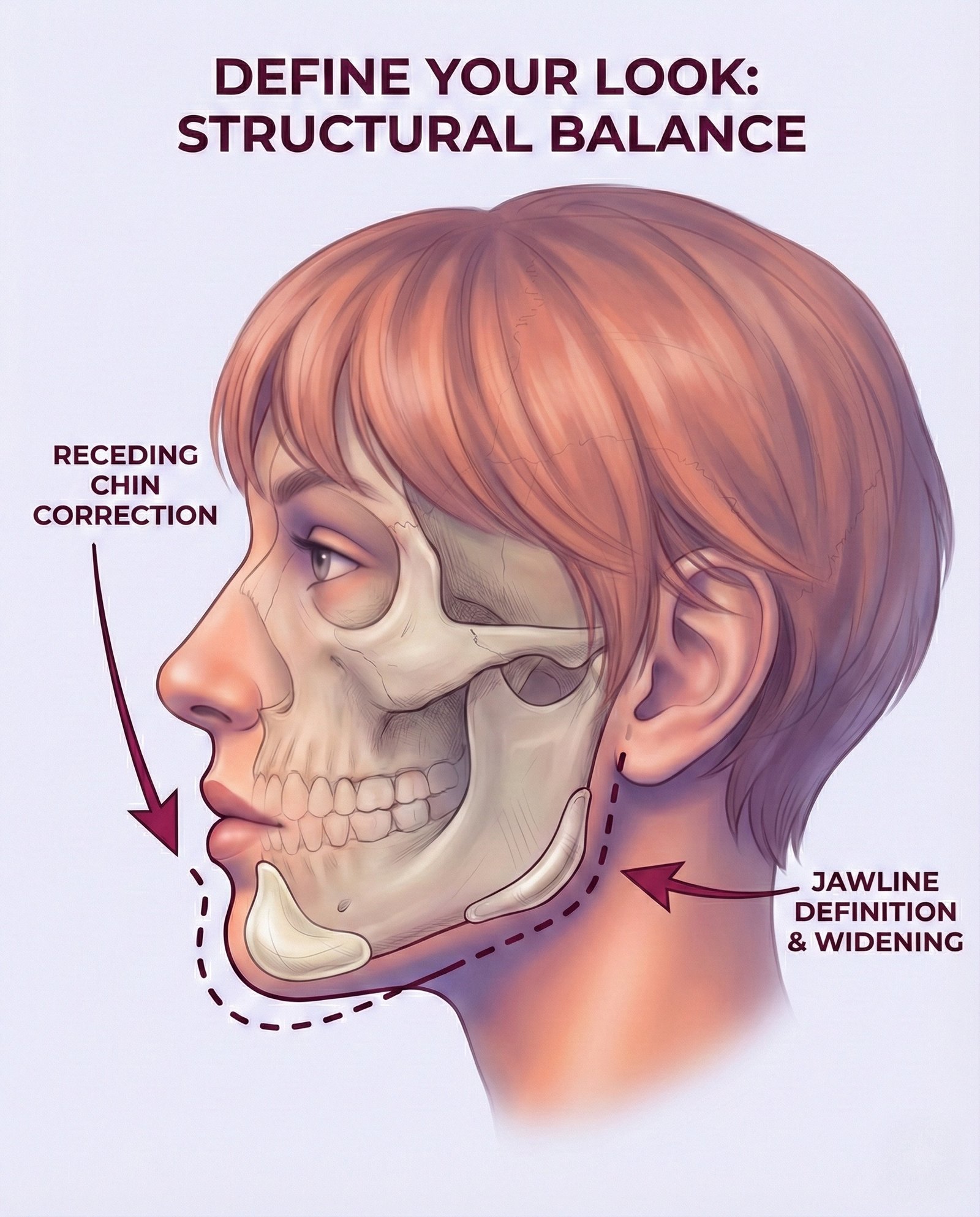 - जबड़ा प्रत्यारोपण: चेहरे के निचले तीसरे हिस्से की चौड़ाई बढ़ाएं, जिससे एक मजबूत और अधिक परिभाषित जॉलाइन मिलती है।