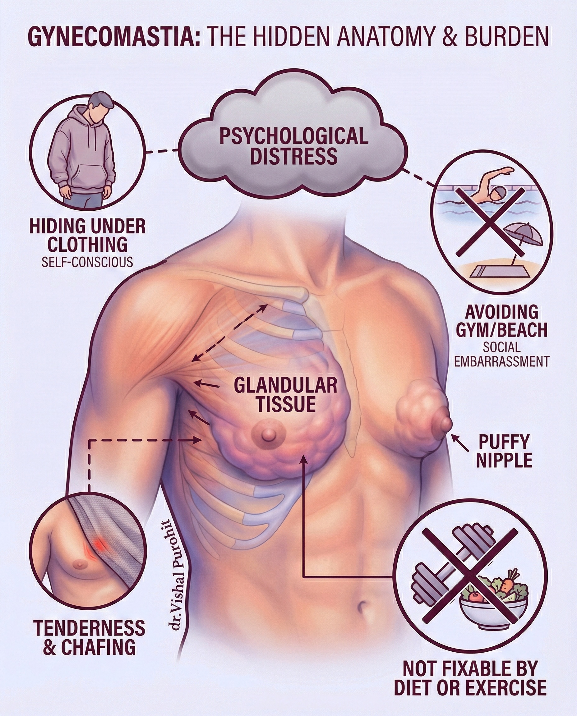 मैं हूँ डॉ. विशाल पुरोहित, जयपुर के बोर्ड-प्रमाणित प्लास्टिक एवं कॉस्मेटिक सर्जन, जिन्हें 10+ वर्षों का अनुभव है, इस पेज पर आपके लिए जानकारी उपलब्ध है। यह पेज बताता है कि गाइनेकोमास्टिया क्या है, सर्जरी कैसे काम करती है, इसकी लागत, रिकवरी का समय और हम आपकी देखभाल को व्यक्तिगत रूप से कैसे अनुकूलित करते हैं।.