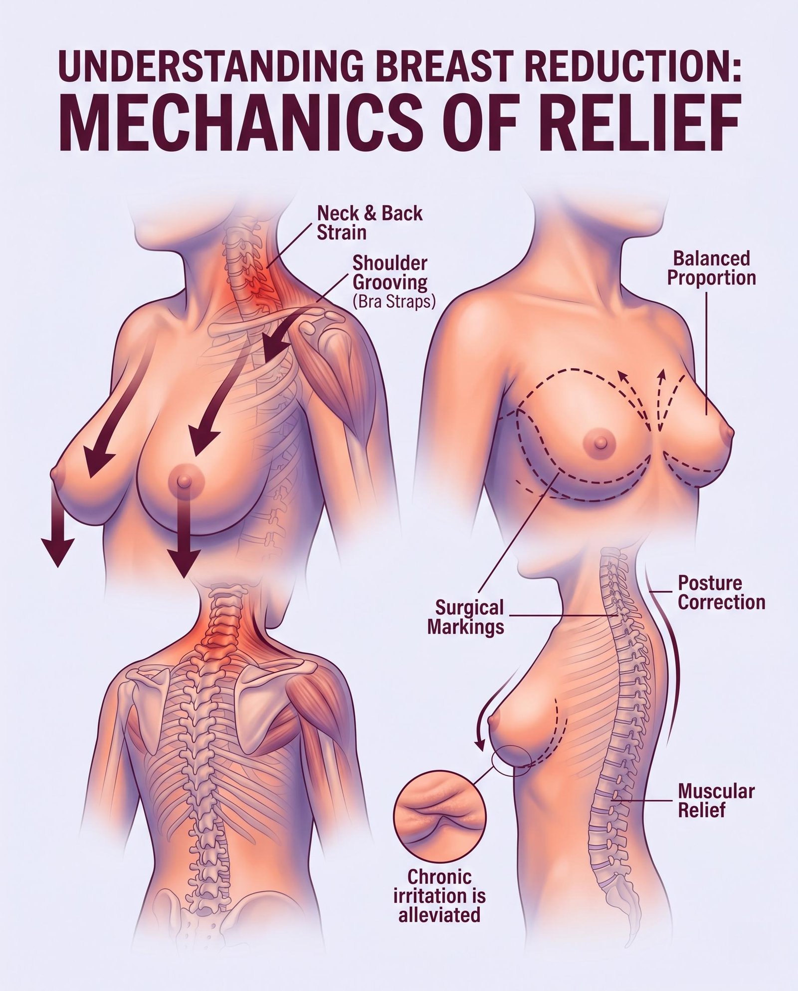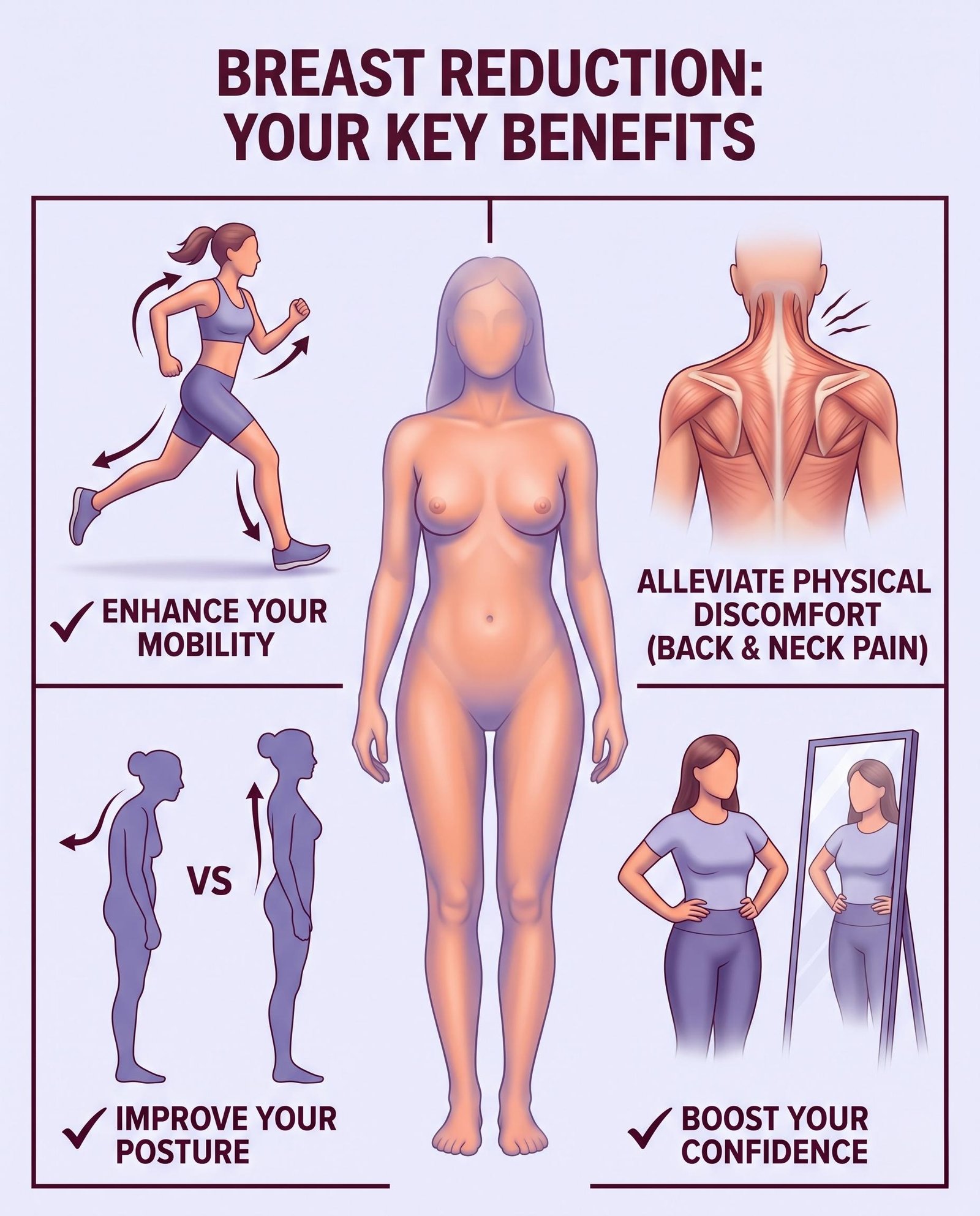 - Improved Posture: Correction of posture affected by the weight of large breasts.